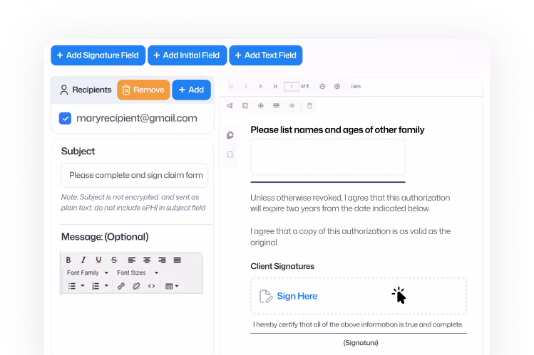 Every signature collected through the platform is legally binding under U.S. electronic signature laws, while also meeting strict security and healthcare standards. The result is a signing experience that’s trusted, compliant, and easy for both you and your recipients.