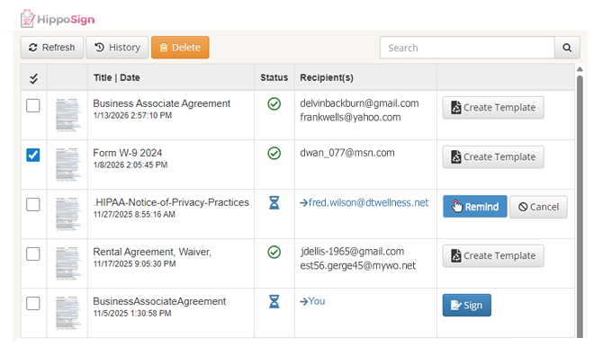 The HippoSign Manage Documents dashboard brings everything together in one place—so you always know what’s been sent, what’s been signed, and what still needs action.